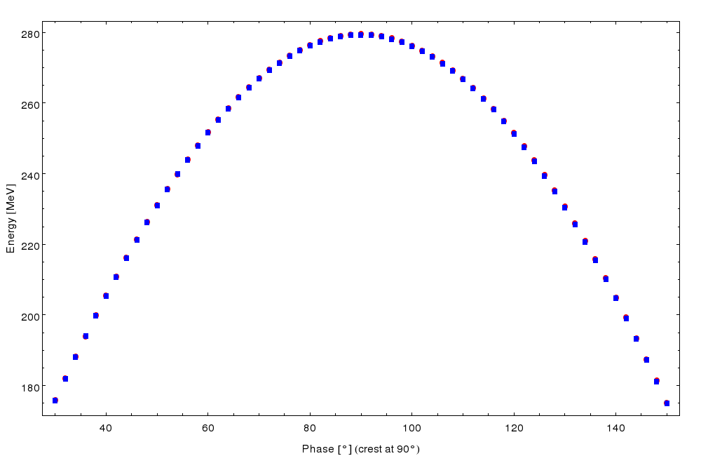 I have come across what seems to be an inconsistency. I've swapped two cavity structures (accelerating from ~70 MeV) and done a phase scan in both. In the first picture all looks ok, the red points are TWLA and the blue points RFCW. But a closer inspection reveals a puzzler - in the second plot I just take the difference between the two. As you can see it looks like there is a difference depending linearly on phase - up until a phase of 110 degrees. Then it goes wild. Any ideas? Cheers,