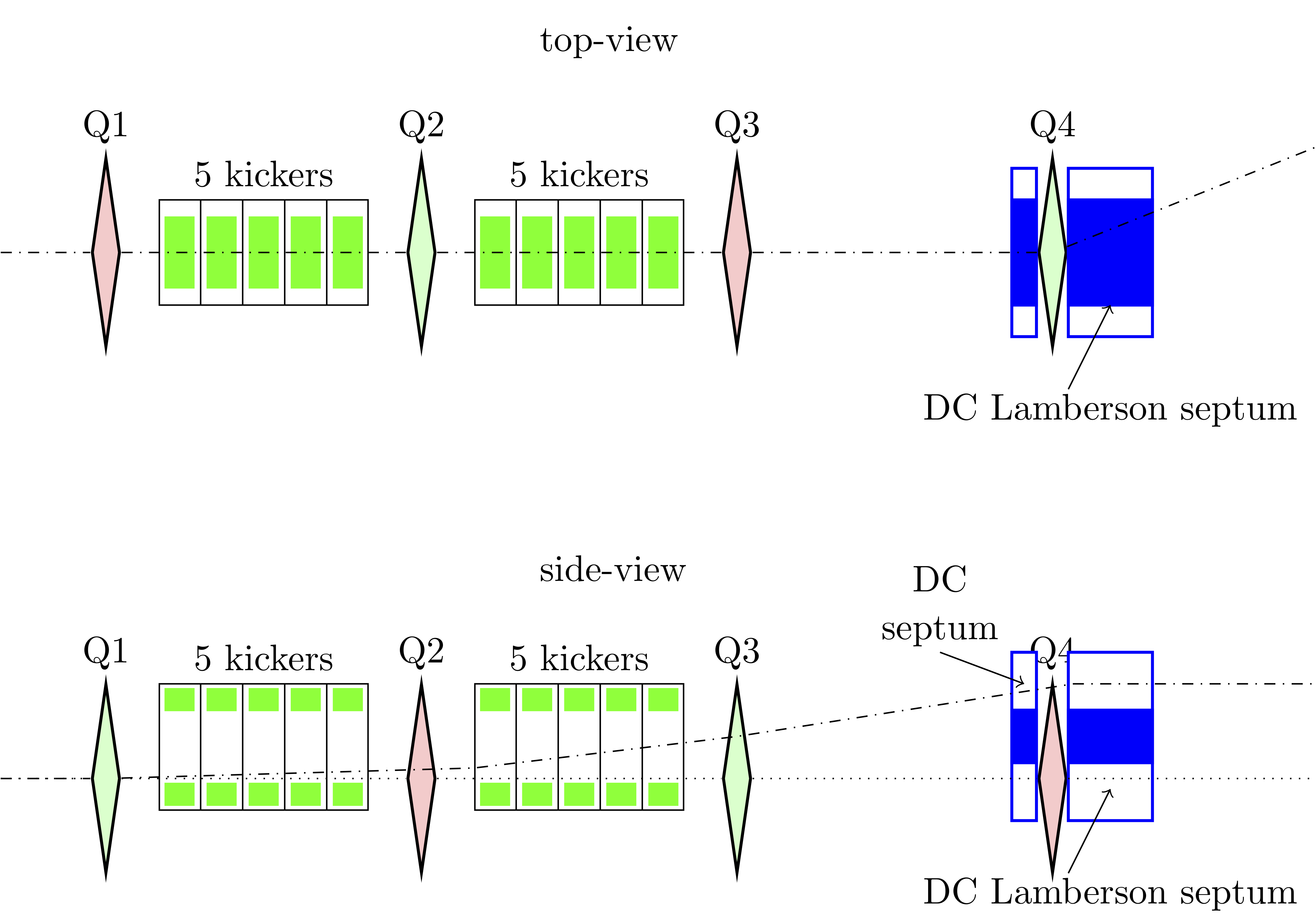 I am designing a fast kicker-septum system for the beam switchyard of a CW X-FEL. Electron beams are distributed by a series of fast-kickers in vertical direction and then pass though a DC Lamberson septum. Between the kicker and septum there are several quadrupoles for beam matching. However, the kick angle is so small that the two direction of beam must share the same quadrupoles. That means there must be at least one direction of beam cannot pass though the quads on axis. The angle of the kicked beam is not only from the kickers but also from the dipole field of the quads. Before the DC Lamberson Septum, there is another DC septum to correct the kicked angle. A schematic view of such a system is seen below.