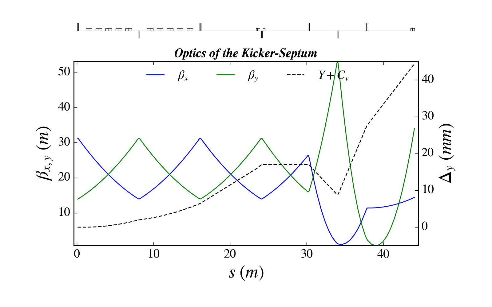 If you want to get survey data for the two beamlines relative to each other, it becomes more complicated. For the straight-ahead case, just turn off all the steering and kicking elements, septa, etc. For the extracted case, you'll need to replace all the steering and kicking elements with bending magnets, and give the middle quadrupole an offset of -Cy, where Cy is the position you computed from the previous simulation.