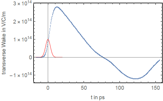 I want to implement wake potentials which I got from the software ECHO. ECHO uses a Gaussian source bunch to calculate the wake potentials. The results from ECHO for an example pillbox cavity and an example Gaussian bunch with sigma=1 mm are plotted below: