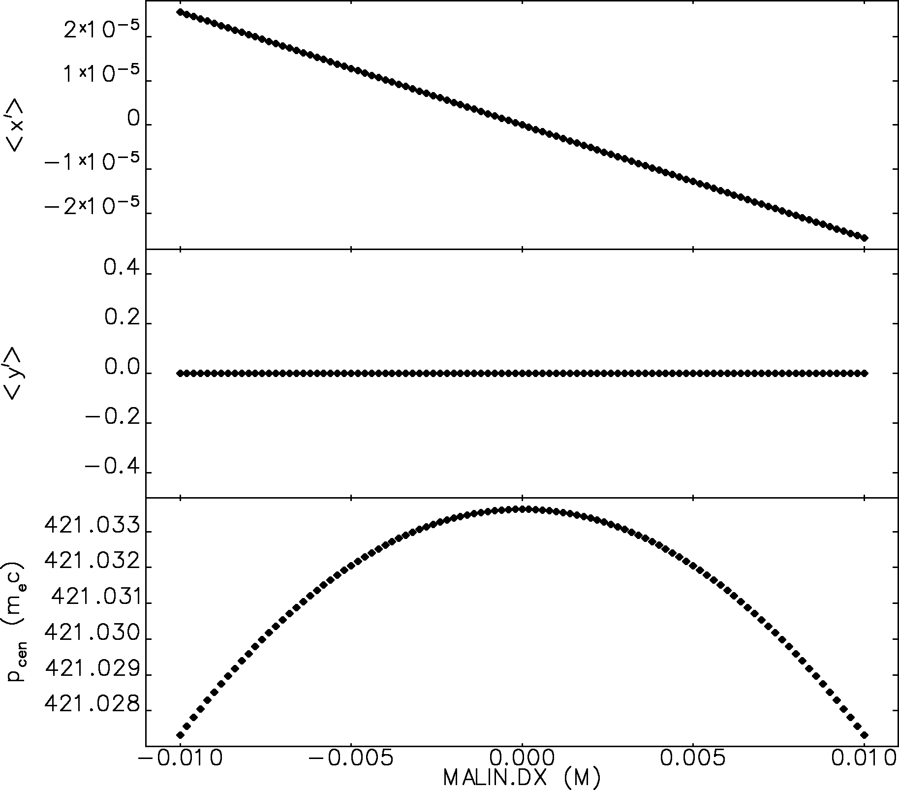 Here's an example with RFTMEZ0 showing how beam gets deflected by the radial fields. I scanned the initial x coordinate of a particle between -10mm and +10mm. At the end, the slope varies linearly due to the radial fields. --Michael