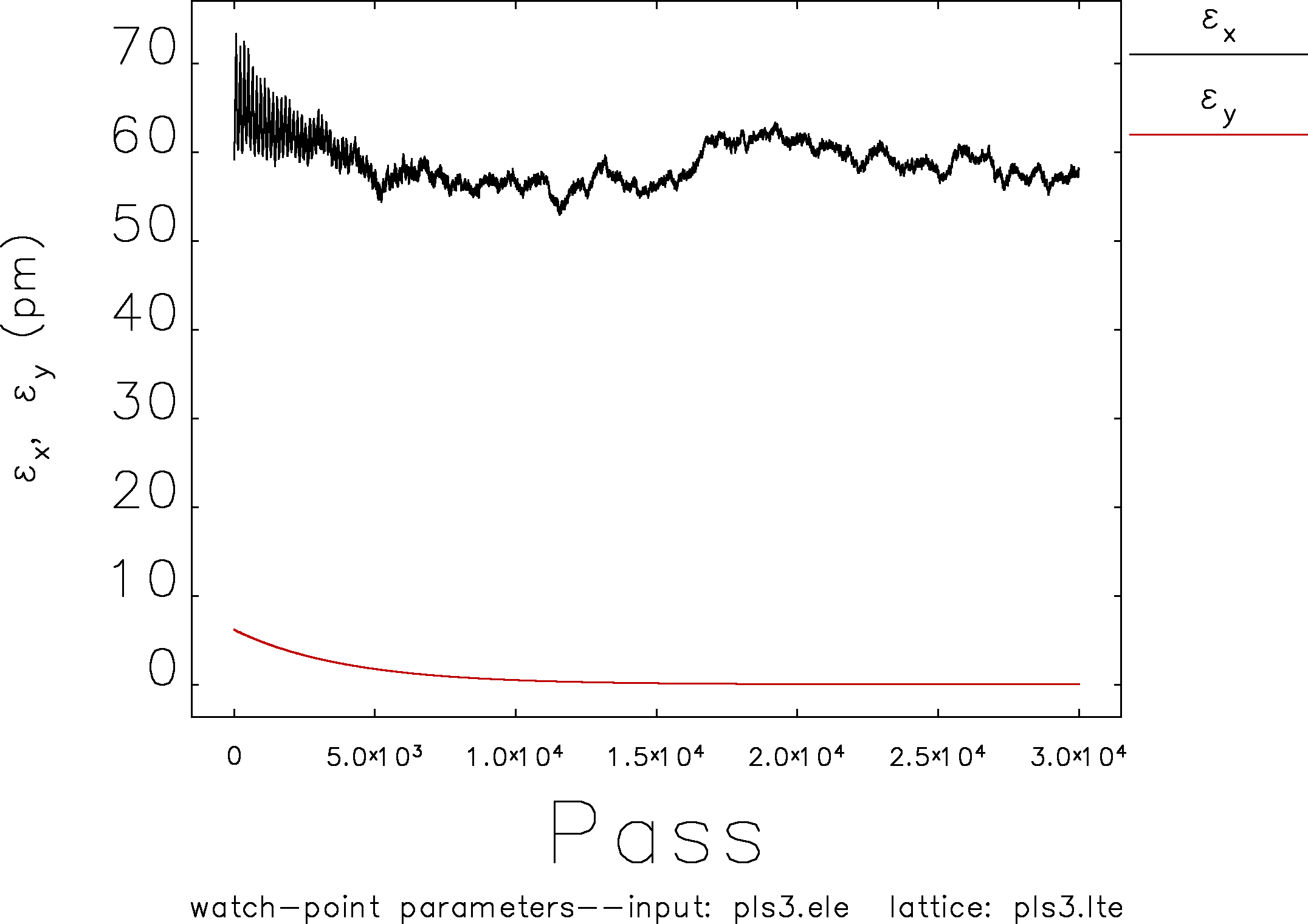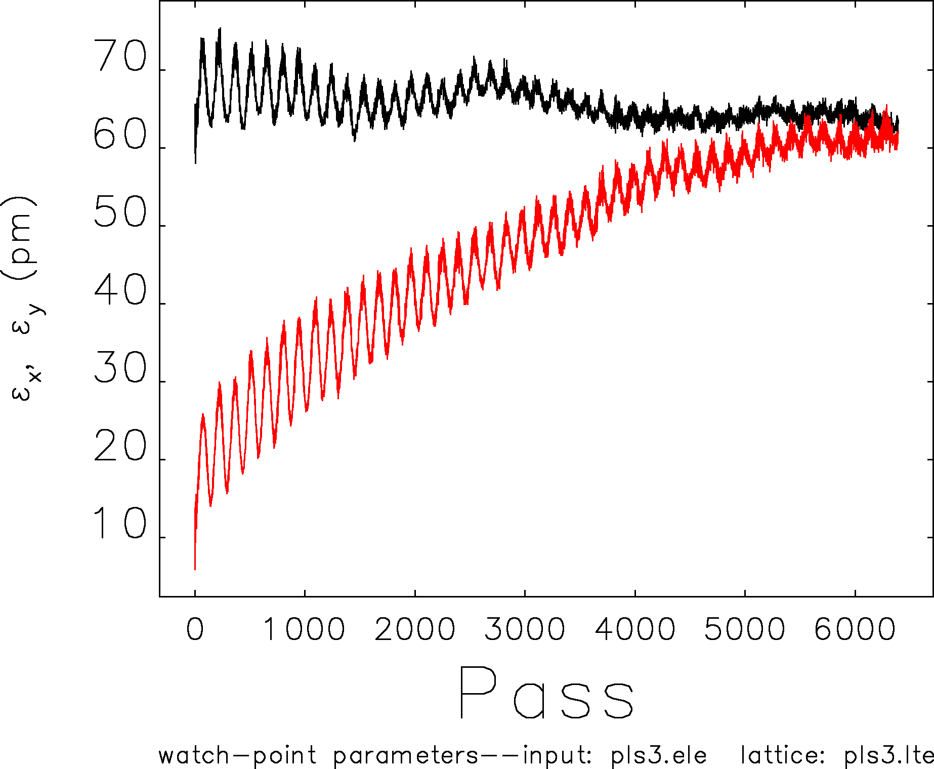 And I checked horizontal and vertical emittance variation according to the pass number also.