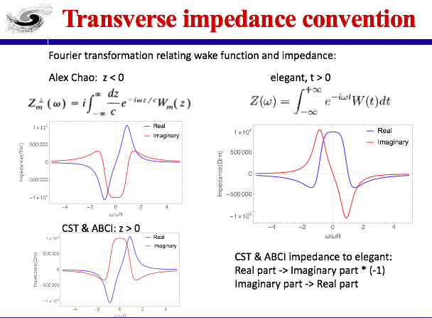 I want to do the tracking considering coupling impedance in the storage ring. I used the impedance output of CST and call them in ELEGANT by ztransverse and zlongit. I also do the tracking with CST wake output and compare the results of these two cases. I was supposed to get the same results but surprisingly, the results were completely different! I could not realize what the problem is. Are there any issues regarding implementing impedance file in my lattice?