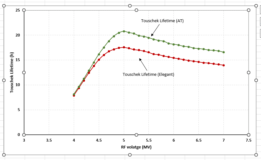 I calculated the Touschek lifetime for an example lattice using both Elegant and AT, and plotted the results for different RF voltages. I observe that the lifetimes obtained from the two codes show noticeable differences. From further analysis, I found that the momentum aperture computed in Elegant is lower compared to AT, which seems to explain why the Touschek lifetime predicted by Elegant is correspondingly smaller. I used element-by-element synchrotron radiation calculations in Elegant by enabling radiation locally using SYNCH_RAD = 1, ISR = 0 for the CSBEND, KQUAD, and KSEXT elements. I also placed rf cavities in the right location in the lattice, that too didn't resolve the discrepancy.