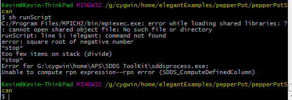 1. I can't do parallel computation,the erros as follows: 2.When I do'nt use the parallel computation, I follow your advice and add two parameters alphax=0 and alphay=0 in .ele file, meanwhile, I output the results when the electron beam reached the pepperpot plate. But I also get the following erros: the output files I before.out and before.sig which I added in the .lte file are too large , about 14GB. The accessory is the elegant files. Can you help me to optimize it? Than you very much!