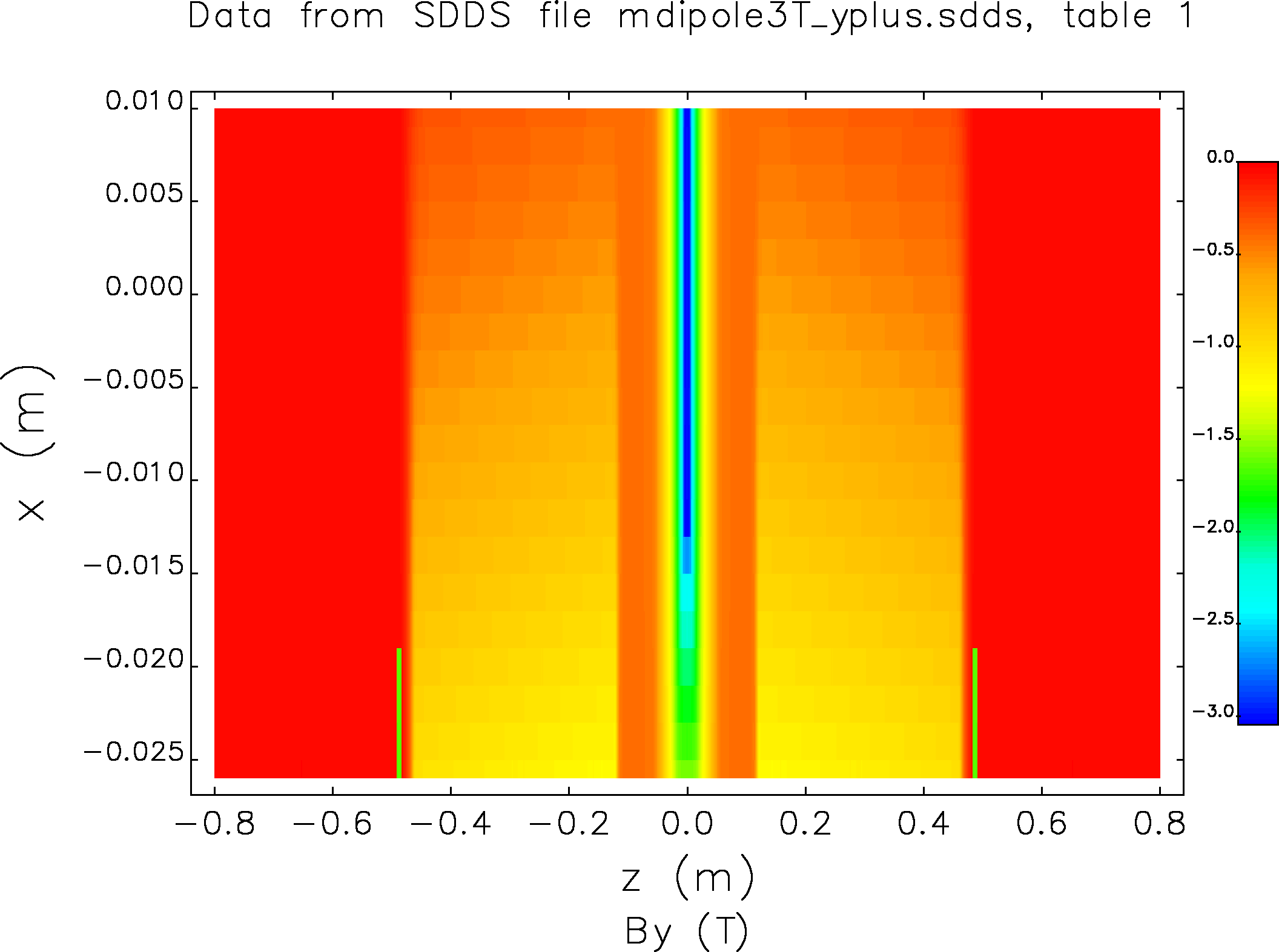 So, I wonder if the limitation in the m values (and in d values as well I think) comes from the fact that the 3D rectangular volume in my case is defined in a non-symmetric manner with respect to x = 0, as you very well pointed it out by showing me the four colored plots of By. Showing those plots to my magnet colleague, I could confirm that they are correct. However, as you saw he defined the horizontal extension to be -0.026 m <= x <= +0.010 m. So without any further specification, I suppose the GGE is done at x = -0.008 m instead of x = 0. Since the treated magnet is a transverse-gradient dipole on the outer parts and a longitudinal-gradient dipole at the center, we cannot make the GGE along the beam trajectory which is curved. However I suppose that the GGE better be done on an axis which is closest to the curved trajectory. Here I wish to have your opinion. I saw in the elegant manual that one could also define the decomposition axis using 'xCenter' and 'yCenter'. However, these parameters do not seem to appear in the description of 'computeRBGGE' so please let me also ask you if there is a way to do so without redefining the rectangular boundaries.