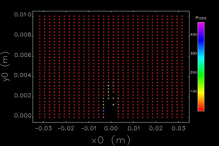 Another method is just to perform tracking with a beam that fills a large rectangle in x-y space. By using the losses parameter of the run_setup command, one can get a record of the lost particles and cross-reference to the initial coordinates using sddsxref (making use of the particleID data in the bunch output file and losses file). This allows making a map of the lost particles color-coded by the turn on which the loss occurs.