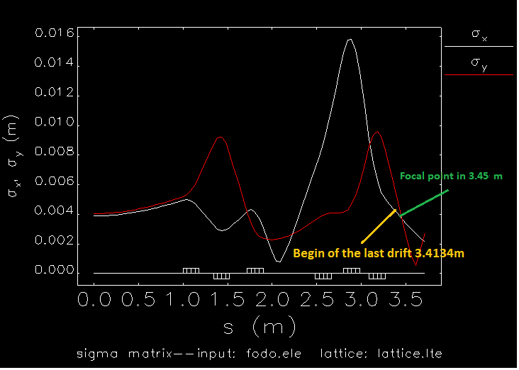 In order to check this results, i repeated the simulations for the symmetric beam in order to find this focal point in 20cm inside this last drift of 30cm. To do this, i created the fodo.ele file (attached) together with lattice.lte file (attached), executed elegant fodo.ele and then using the command: