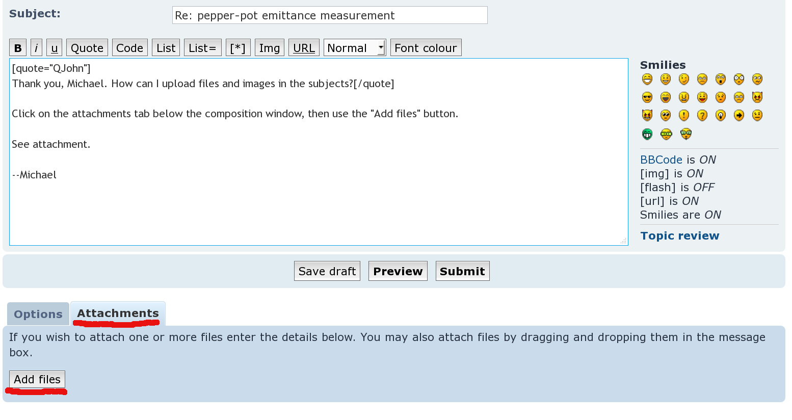 Click on the attachments tab below the composition window, then use the "Add files" button.QJohn wrote: Thank you, Michael. How can I upload files and images in the subjects?