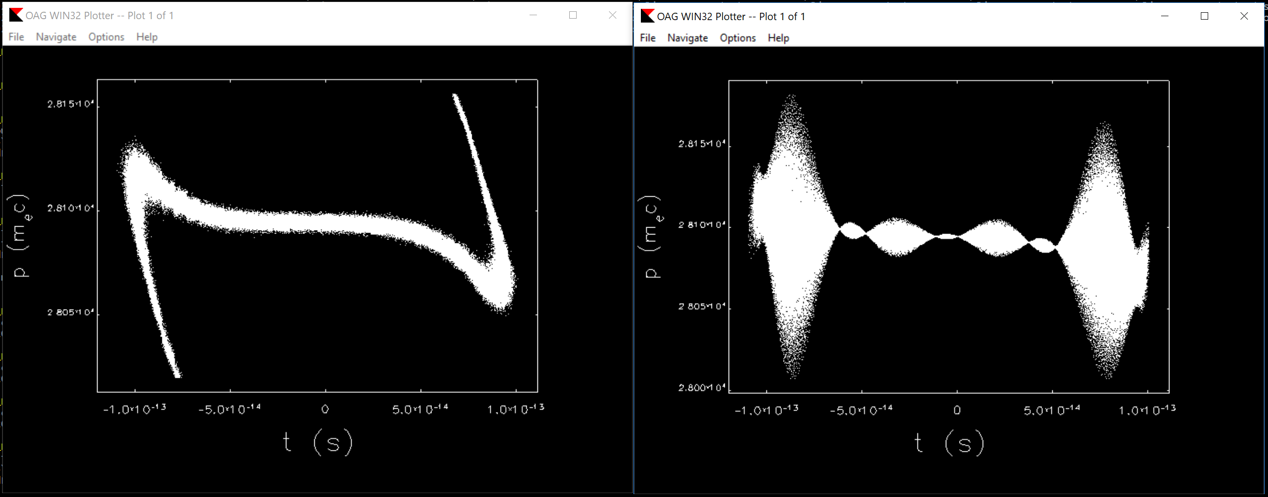 sddsplot -graph=dot -sep=1 -same -layout=2,2 -col=t,p P200k_e1220.sdds P200k_e1220.sddsx2