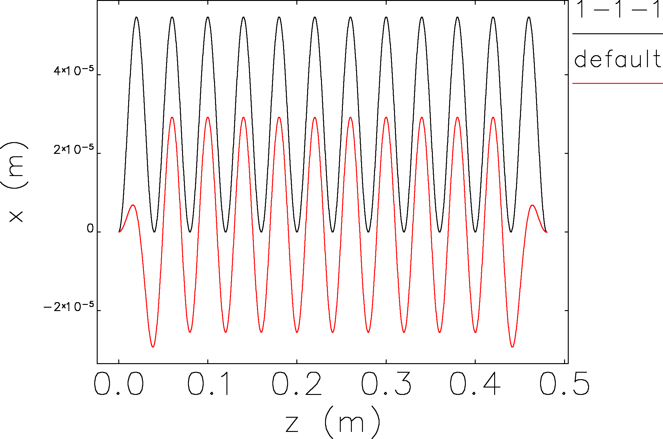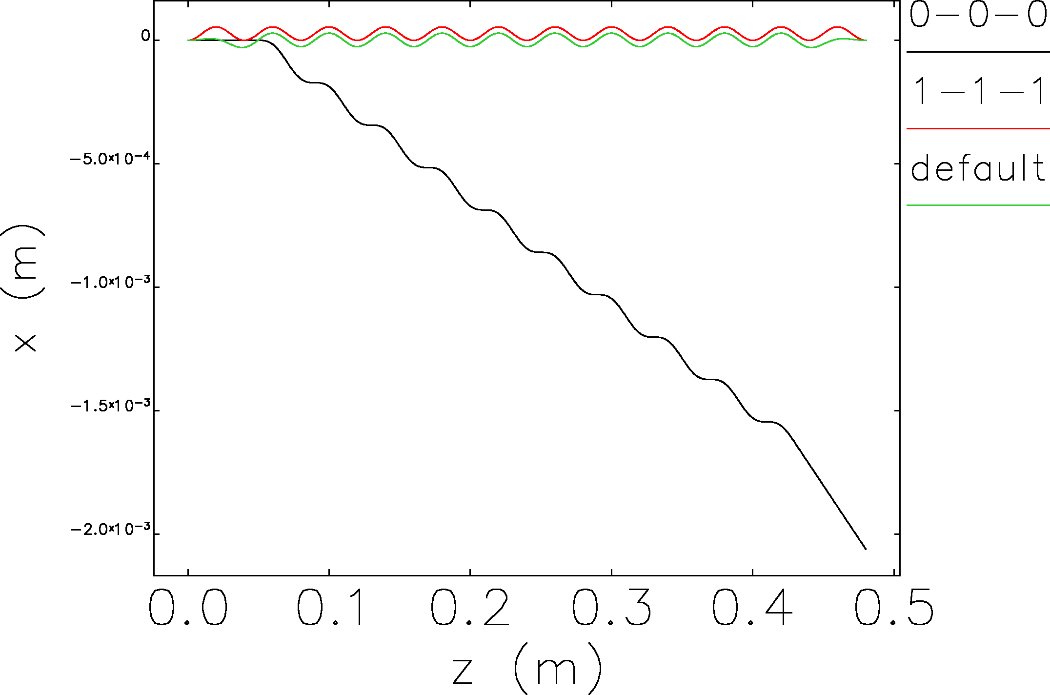 Using some debugging switches at compile time, I extracted the trajectory inside LSRMDLTR and compared it for several values of POLE_FACTOR[123]. The particle starts on axis with delta=1e-4, so we see the effect of dispersion here. Notice that for the default values, the particle is centered in the undulator, whereas for 1,1,1 it is offset to one side. This is the reason the default values are set as they are.