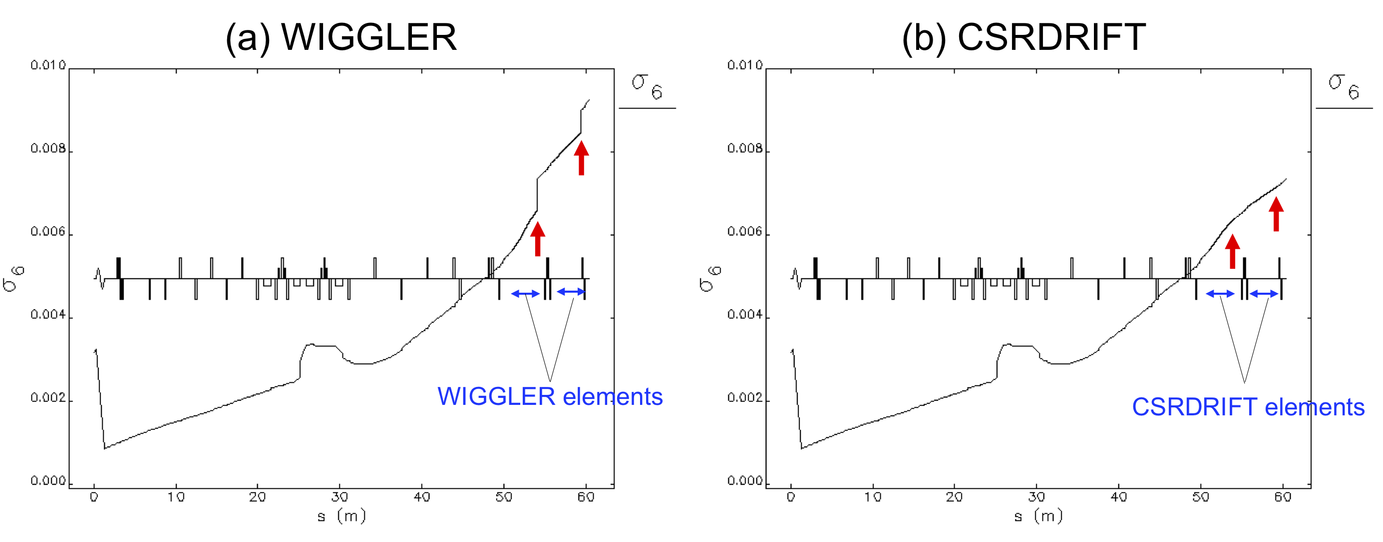 Fig. (a) is for the WIGGLER case and Fig. (b) is for the CSRDRIFT case.