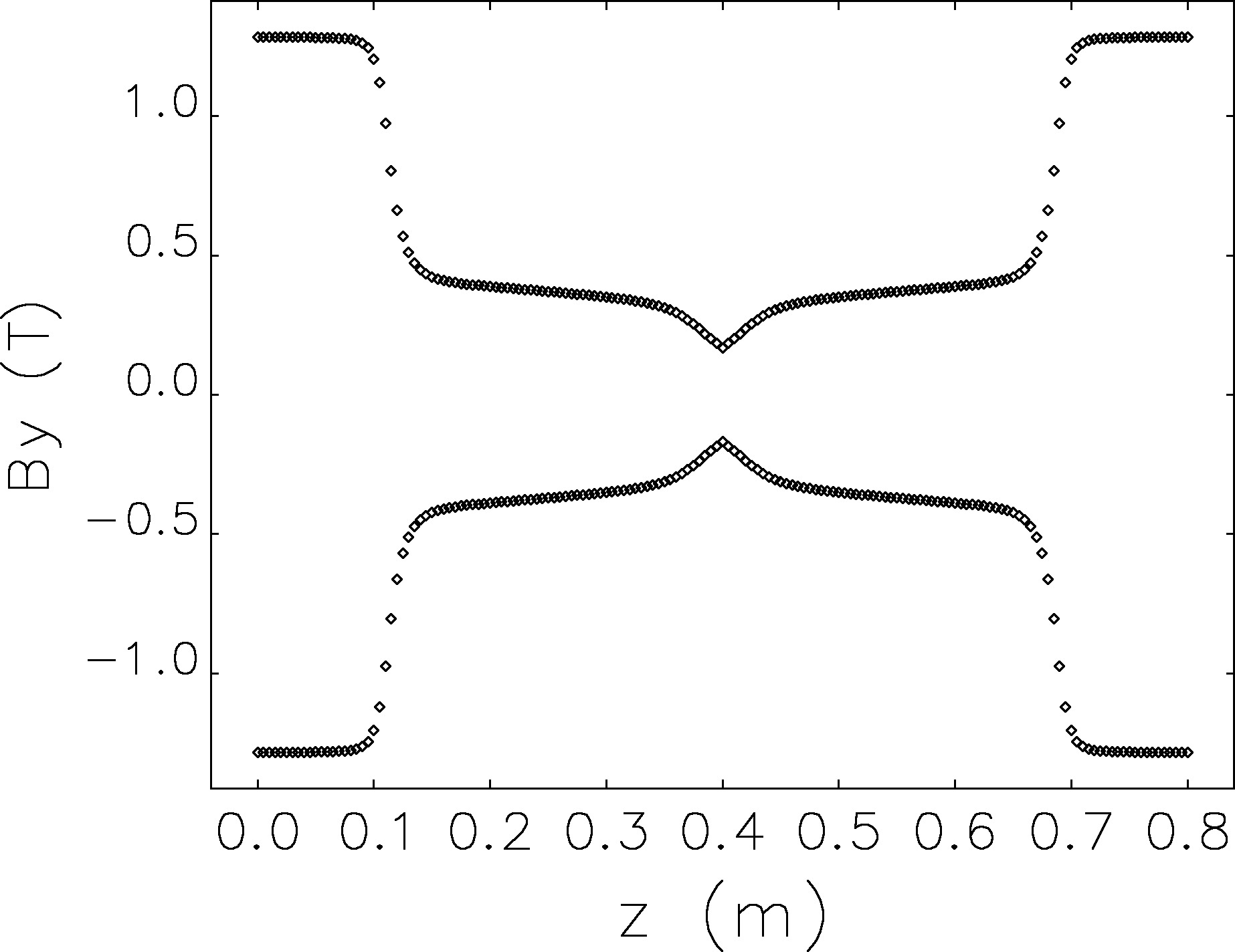 $ sddsplot -col=z,By magmnew.sdds -filter=col,y,-1e-6,1e-6 -filter=col,x,-1e-6,1e-6 -graph=sym