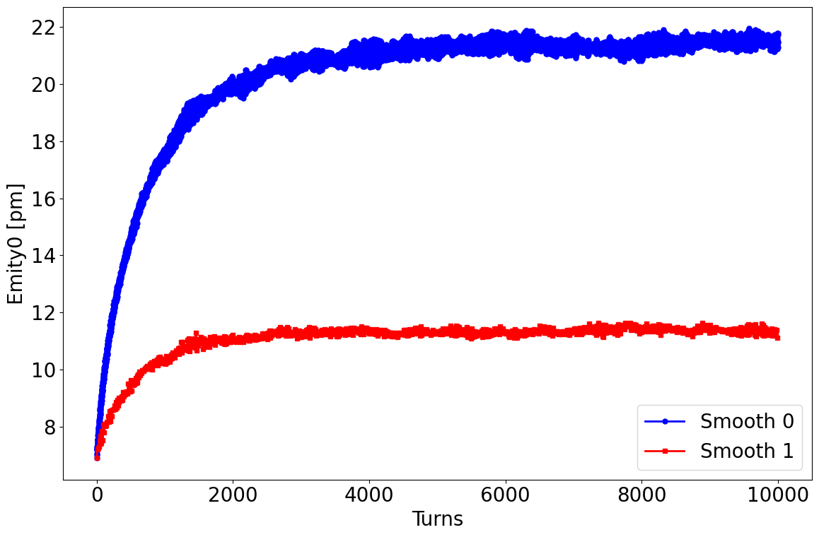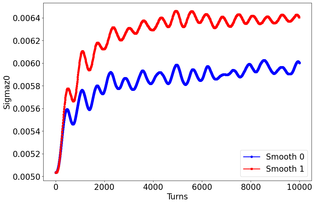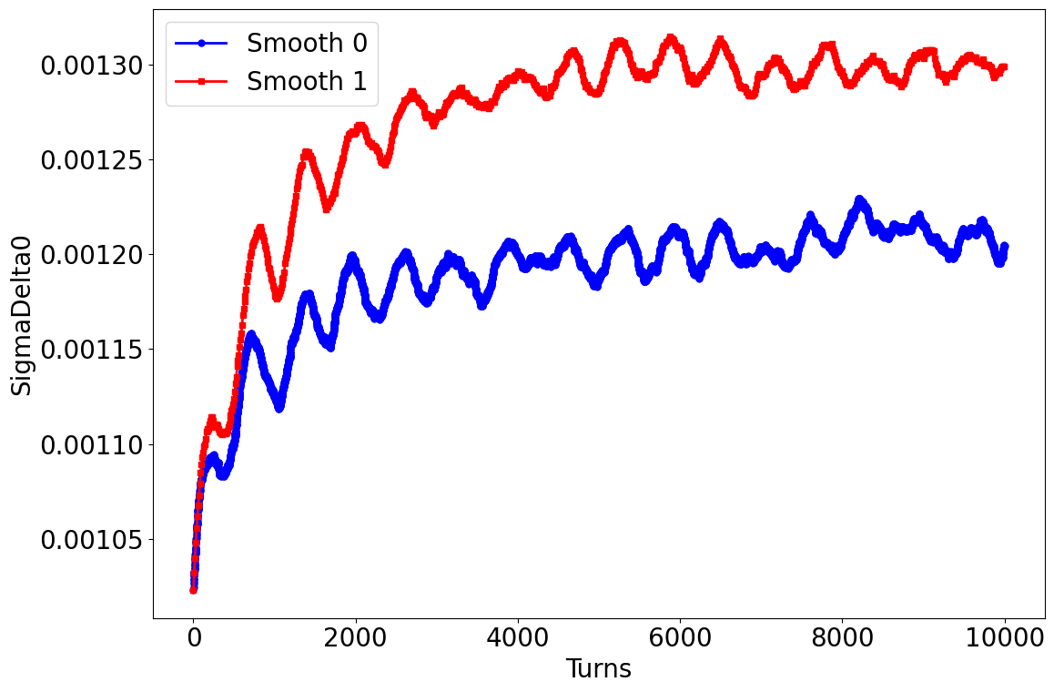 When using IBSCATTER to simulate the IBS effect, there is a parameter called SMOOTH in IBSCATTER. I believe that setting SMOOTH to 1 or 0 may result in different paths for the variation of beam parameters, but the final equilibrium state should be relatively consistent. However, after comparing the results with different SMOOTH settings, I found that the beam equilibrium state parameters differ significantly, as shown in the attached files. How can this be explained?