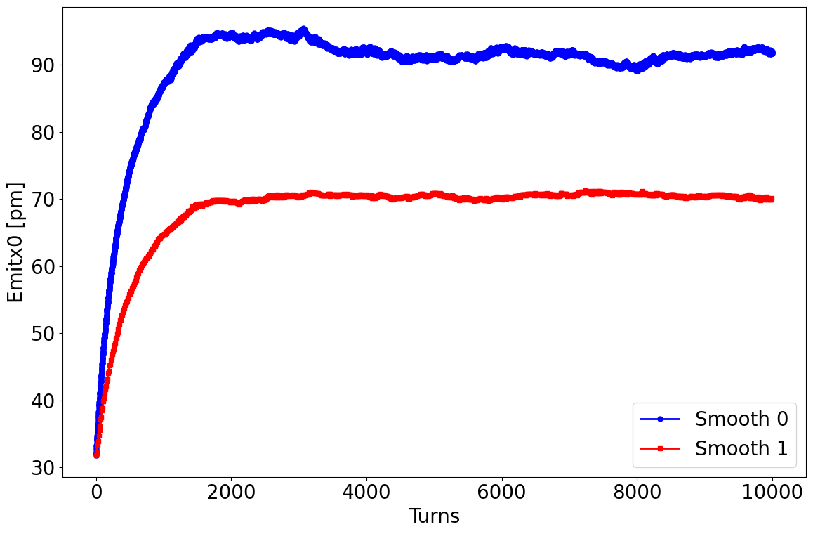When using IBSCATTER to simulate the IBS effect, there is a parameter called SMOOTH in IBSCATTER. I believe that setting SMOOTH to 1 or 0 may result in different paths for the variation of beam parameters, but the final equilibrium state should be relatively consistent. However, after comparing the results with different SMOOTH settings, I found that the beam equilibrium state parameters differ significantly, as shown in the attached files. How can this be explained?