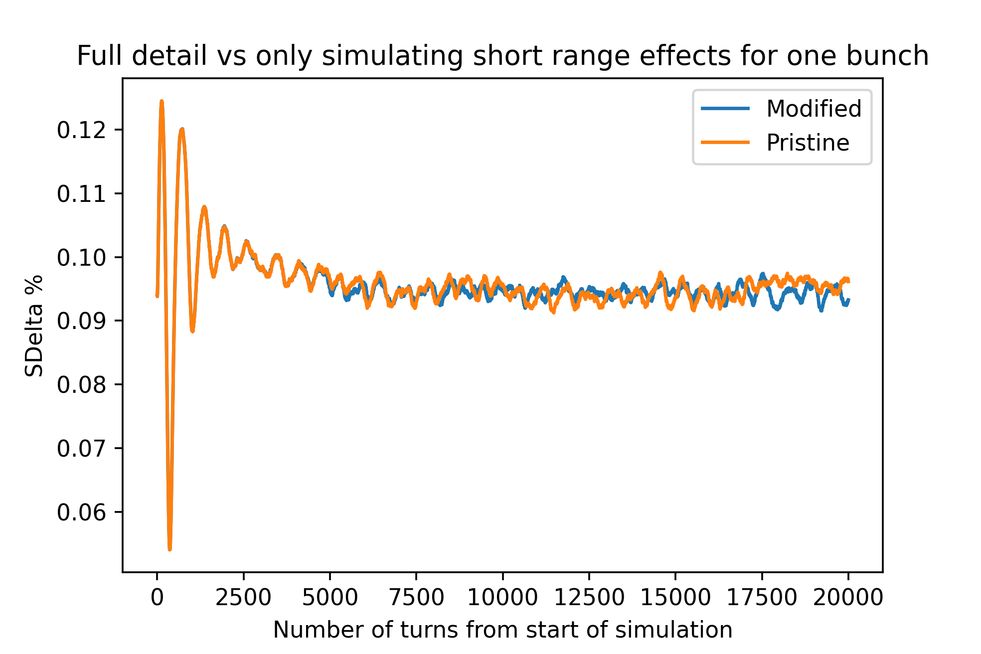 It's nothing complicated, I literally just disable the processing of the short range impedance for any bunch that I'm not interested in via an IF statement. For 20k turns, ILMatrix, 1 thread, with 1250*899 particles I get 100:05:19 vs 08:53:37. Obviously it cannot be identical to the normal simulation, but as an example here are two meaningful quantities I care for in my work: